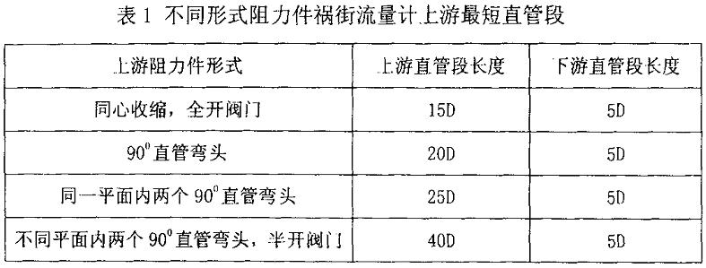 由于渦街流量計(jì)是利用流體自身的規(guī)則振蕩來計(jì)量流量的,因而對(duì)流體的速度分向及流動(dòng)噪聲,比較敏感,因此在應(yīng)用過程中對(duì)管道安裝狀況要求較高。對(duì)L游不同形式的阻力件必須配置足夠長(zhǎng)的滿足不同要求的直管段,以保證儀表的測(cè)量精度。表l給出了不同形式阻力件禍街流量計(jì)上游最短直管段。